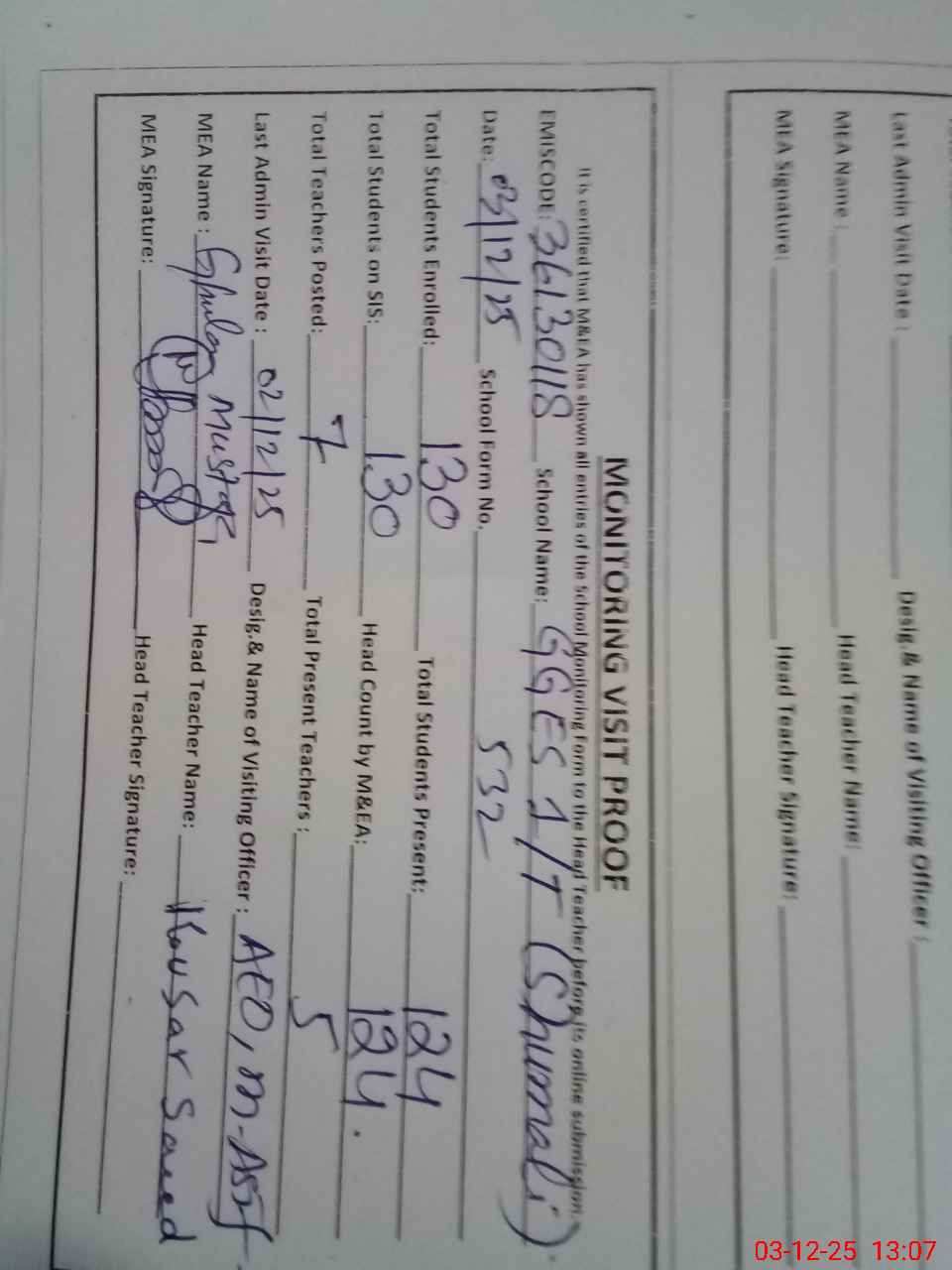 | Certified that this School was Inspected by the Undersigned MEA/DMO Today and the Information Stated Above is as Per Record. | |||||