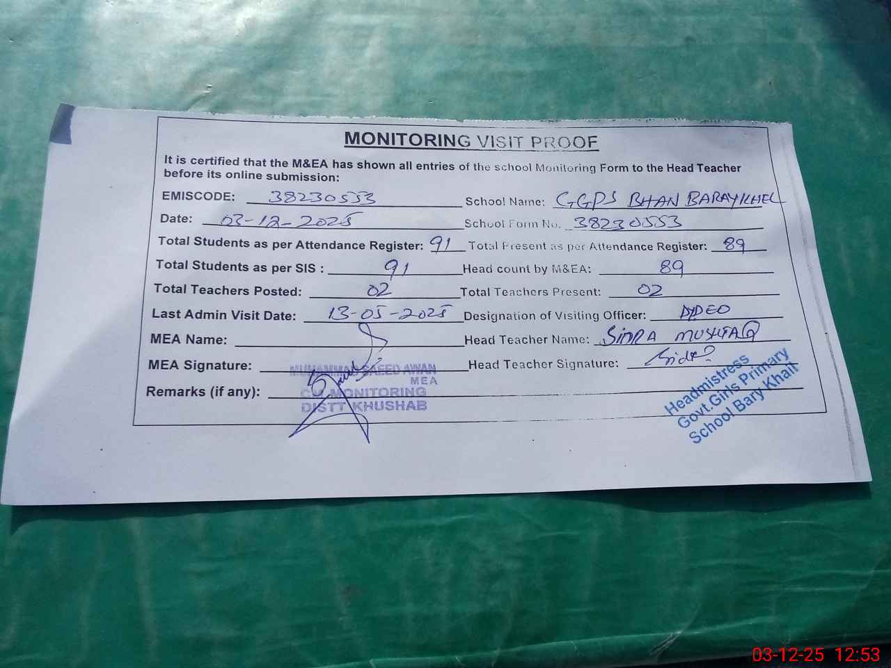 | EMIS Code: 38230553 | Name of School: GGPS BHAN BARRY KHAIL | |||
