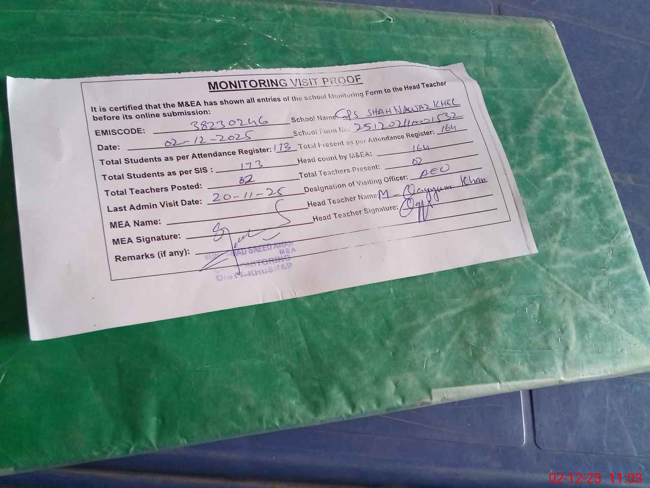 | Remarks (Use Separate Page if Required): Students on SIS QTY 173 Last admin visit On 20 November 2025 by AEO | |||||