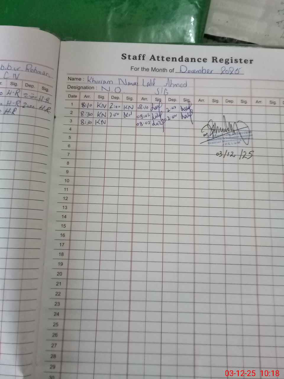 | CNIC | Full Name | Designation | R/C | Absence during last cal. month |
