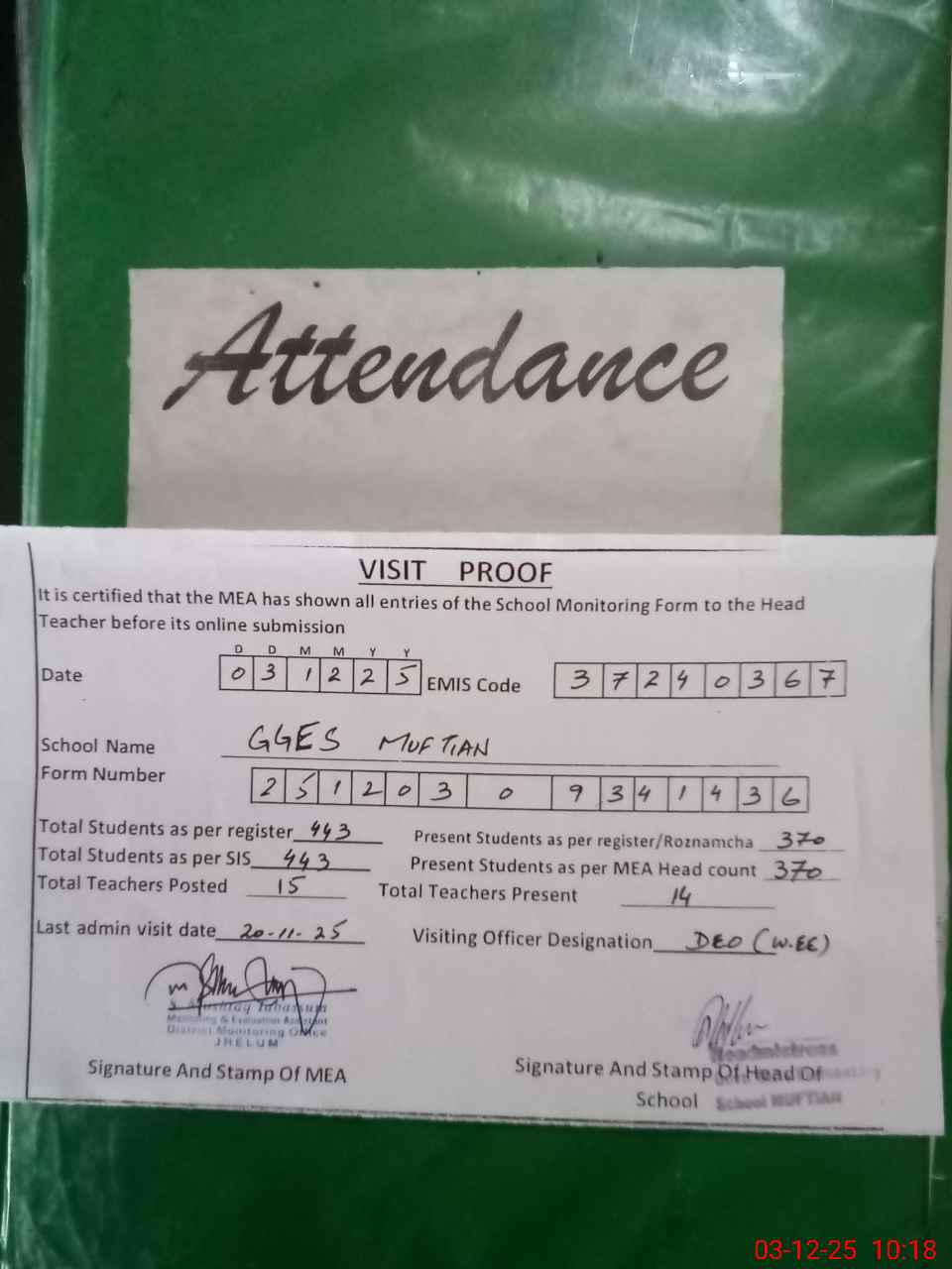 | Attendance Register | Head Teacher | MEA with School | Visit Proof |