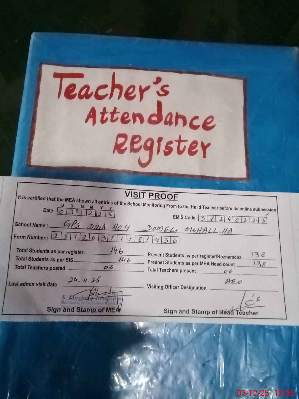 | Attendance Register | Head Teacher | MEA with School | Visit Proof |