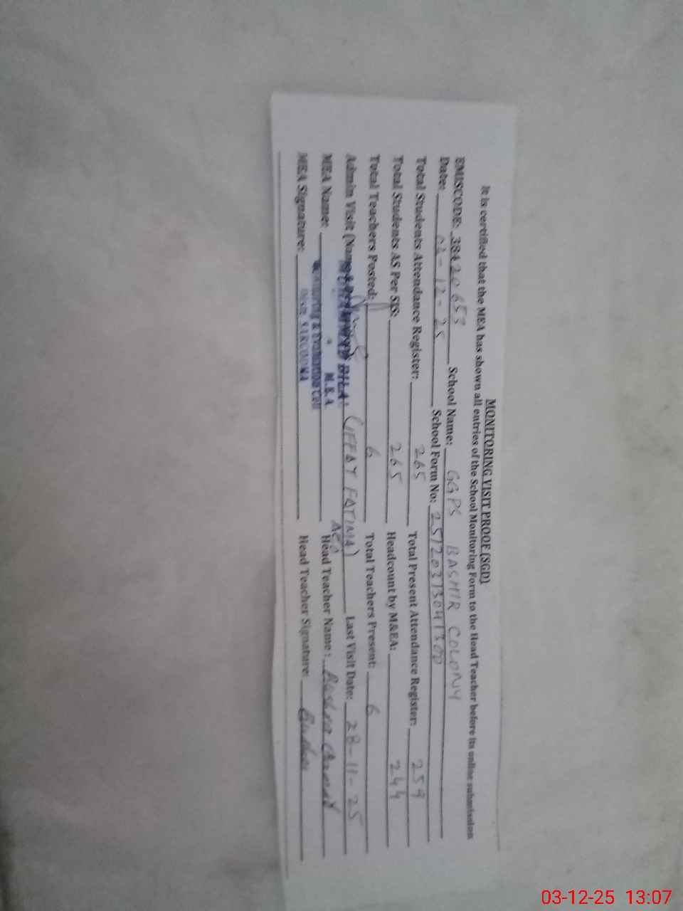 | Attendance Register | Head Teacher | MEA with School | Visit Proof |