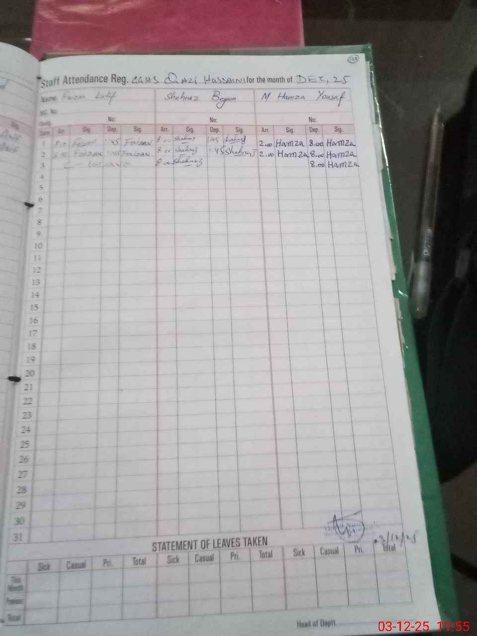 | CNIC | Full Name | Designation | R/C | Absence During Last Calender Month |