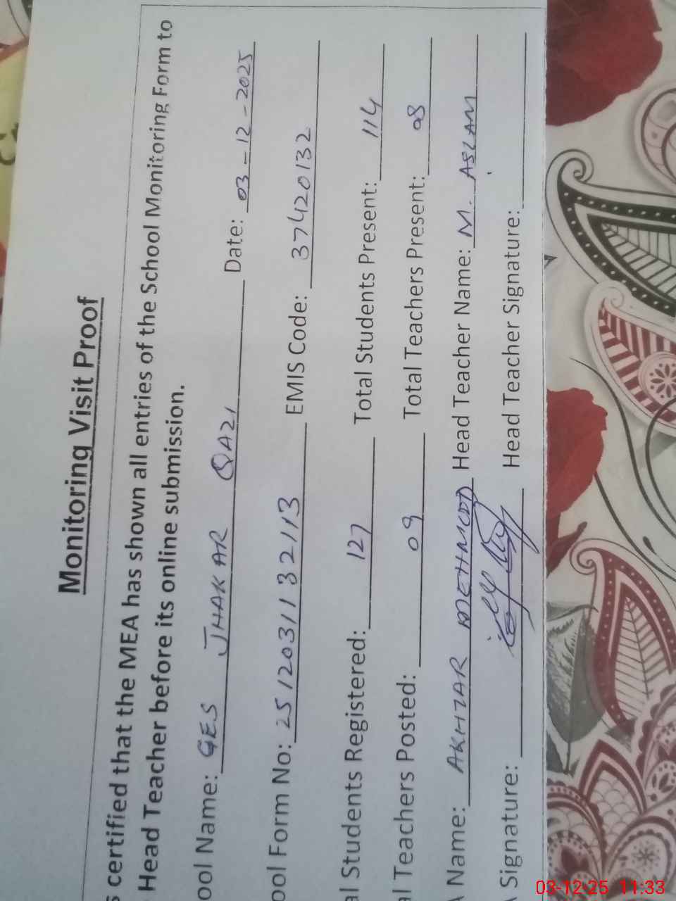 | Attendance Register | Head Teacher | MEA with School | Visit Proof |