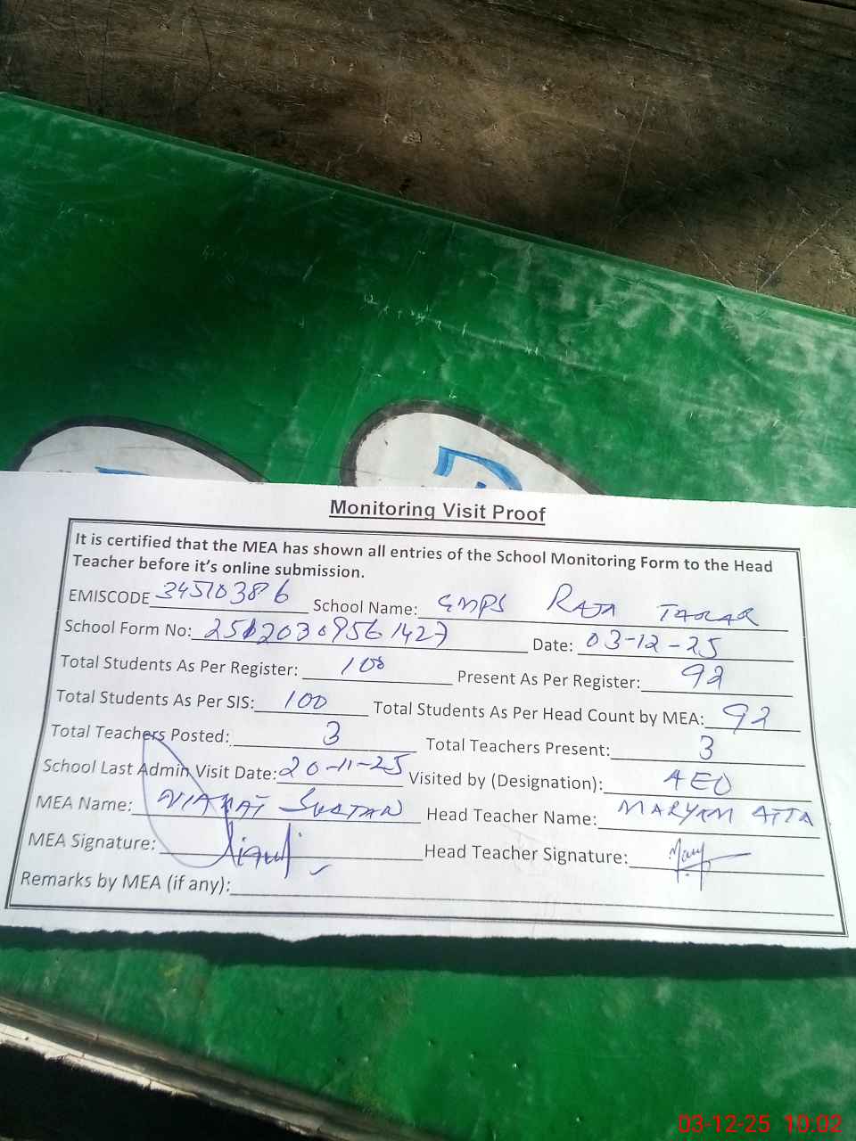 | EMIS Code: 34510386 | Name of School: GMPS RAJA TARAR | |||