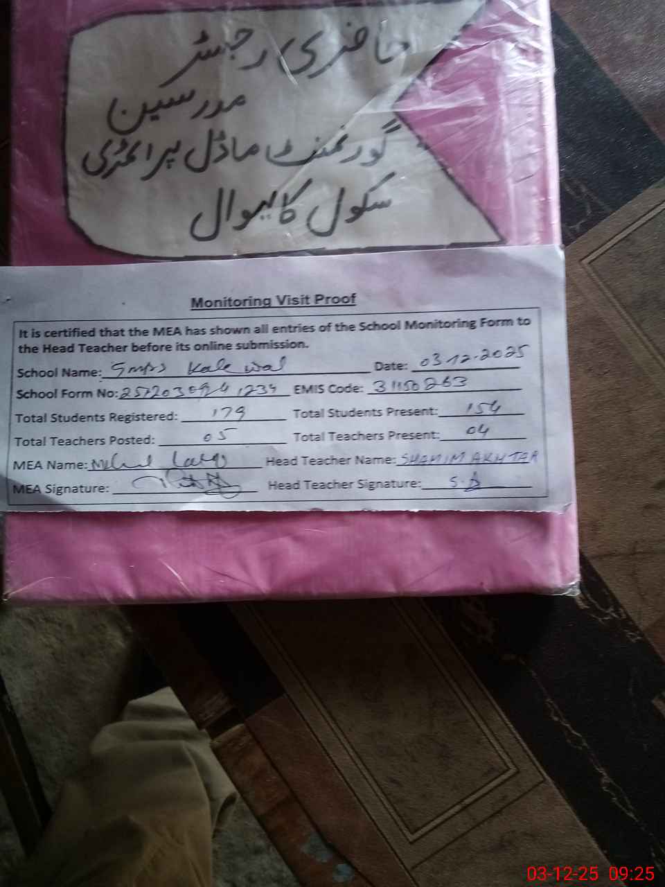 | Attendance Register | Head Teacher | MEA with School | Visit Proof |