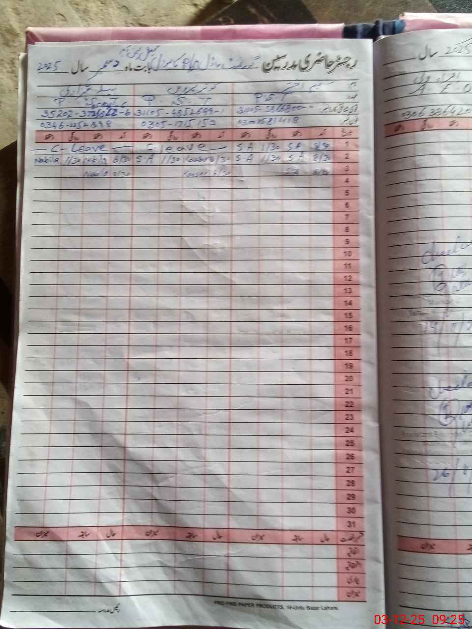 | CNIC | Full Name | Designation | R/C | Absence During Last Calender Month |