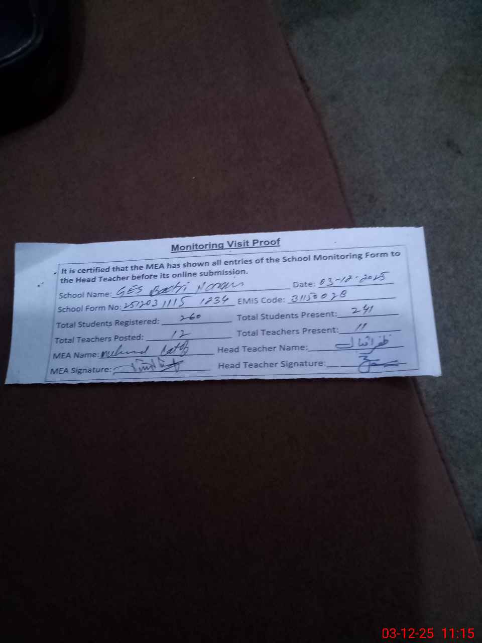 | Attendance Register | Head Teacher | MEA with School | Visit Proof |