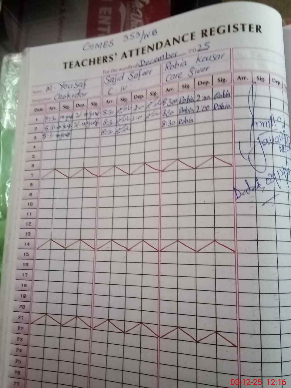 | CNIC | Full Name | Designation | R/C | Absence during last cal. month |