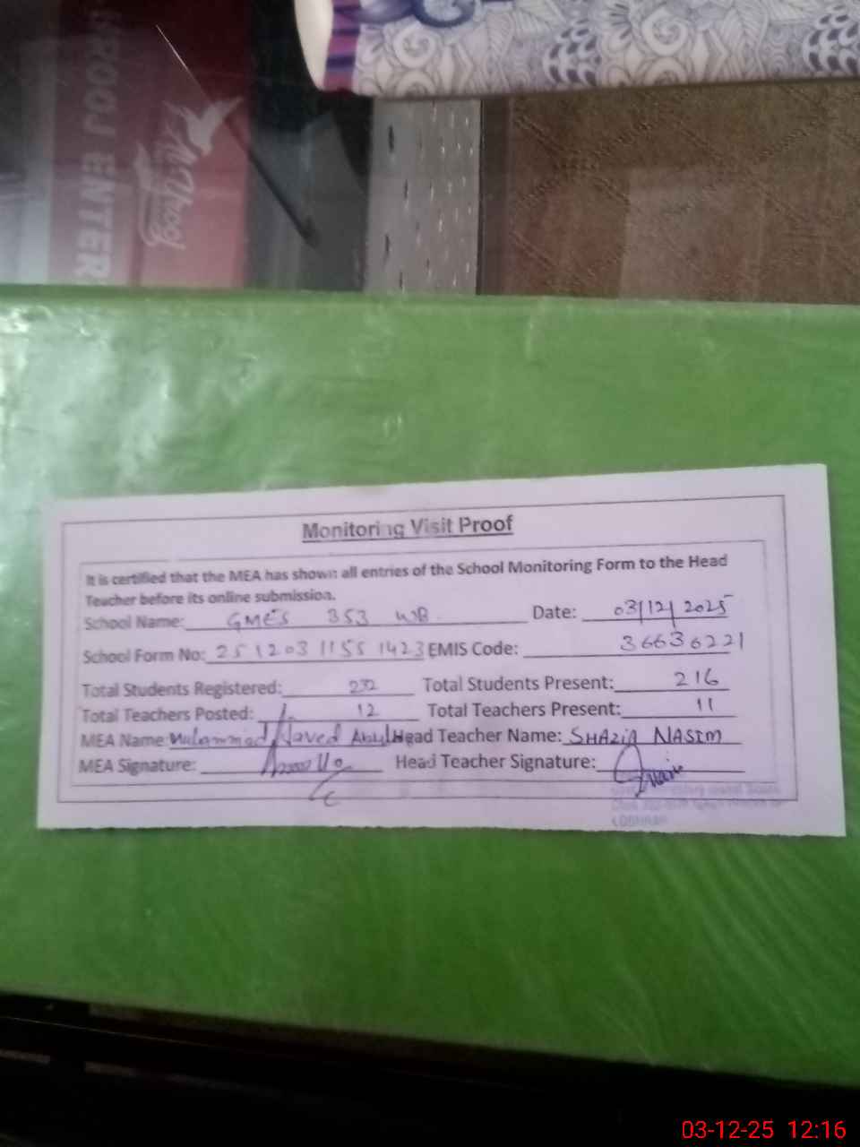 | Attendance Register | Head Teacher | MEA with School | Visit Proof |