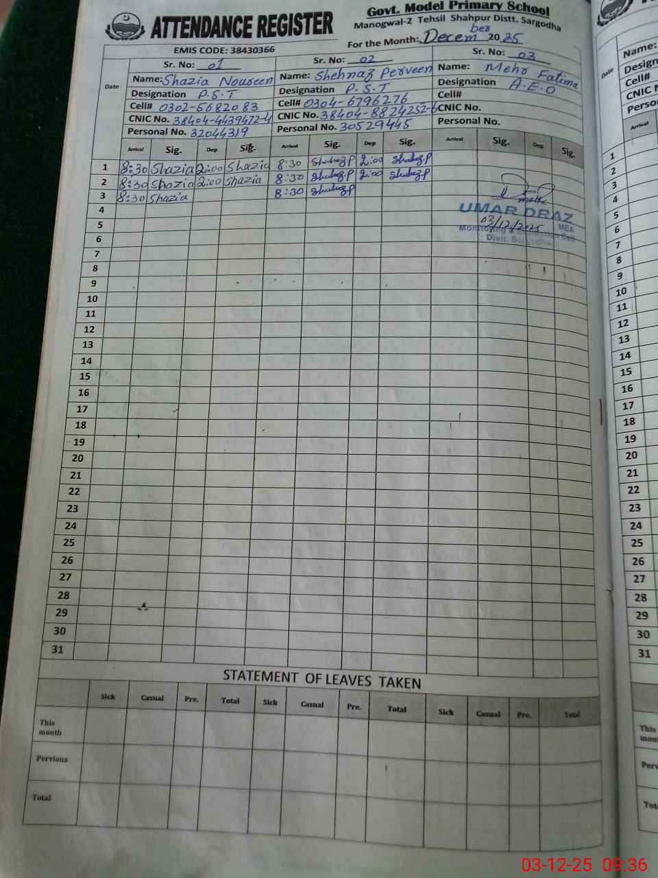 | CNIC | Full Name | Designation | R/C | Absence During Last Calender Month |