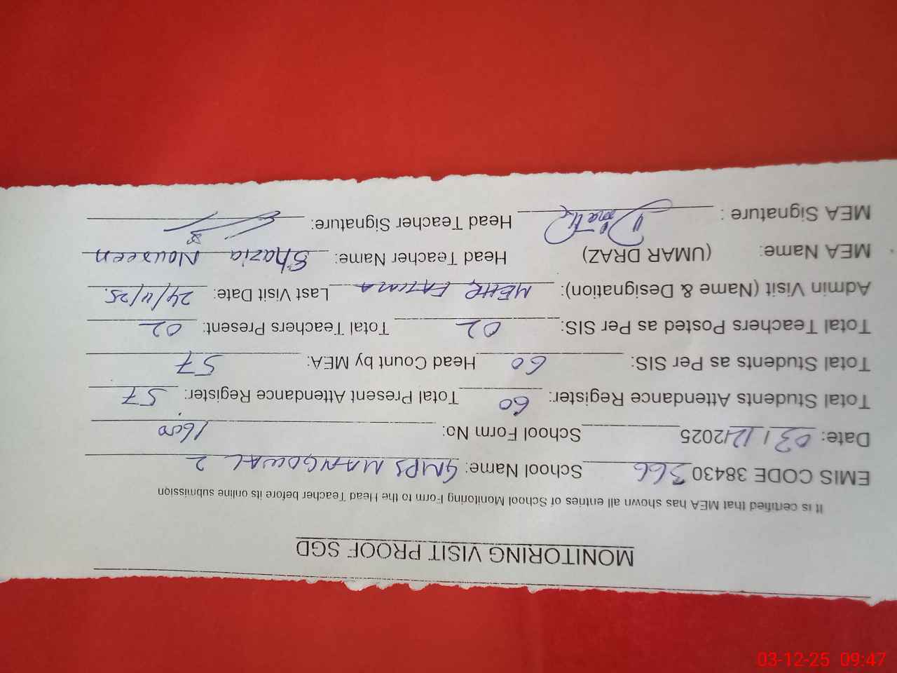 | Attendance Register | Head Teacher | MEA with School | Visit Proof |