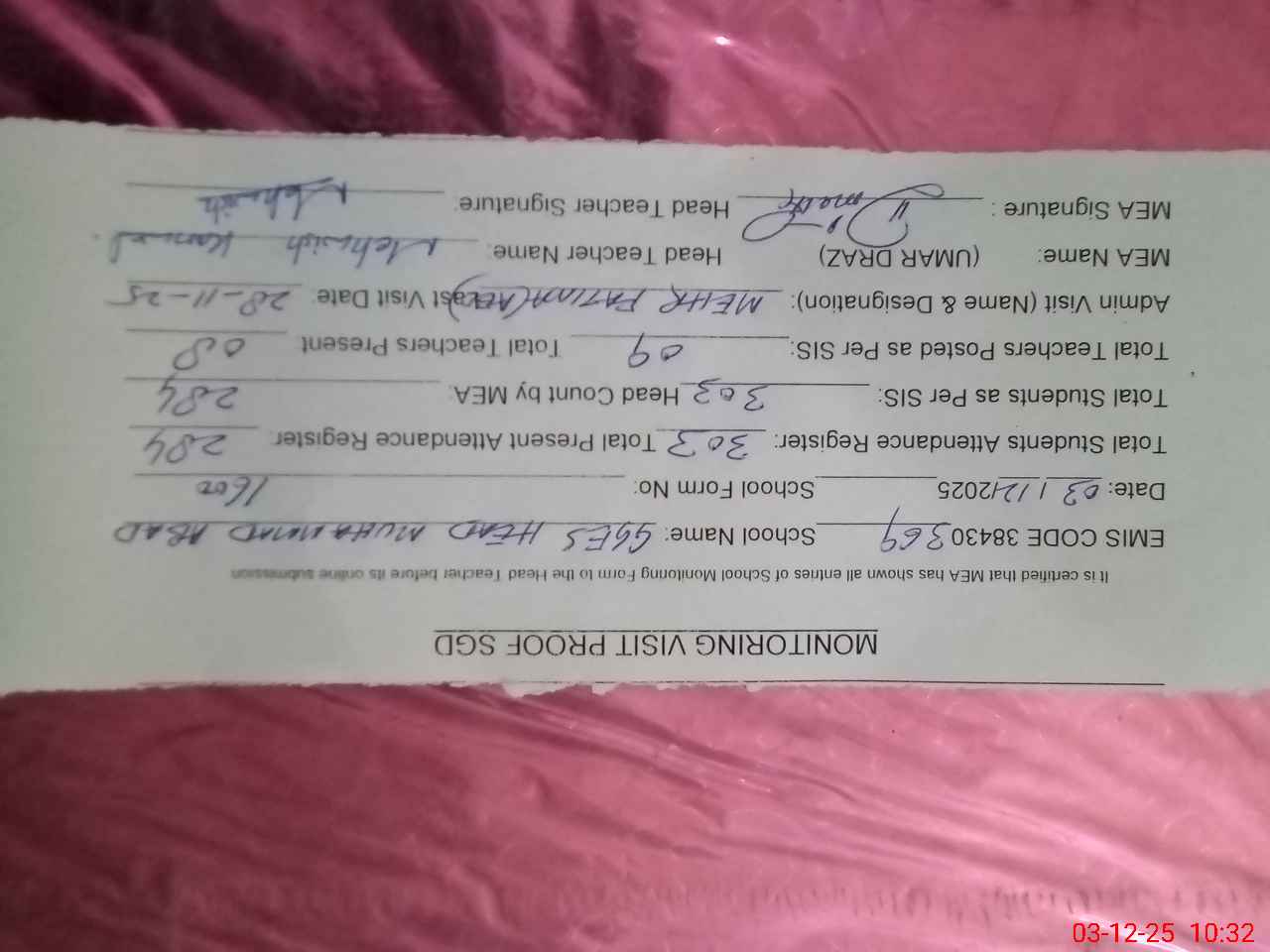 | Name: ME**** KA**** Designation: (School Headmaster's/Headmistress's) SSE (SCIENCE) Phone/Cell Number: 03**** |