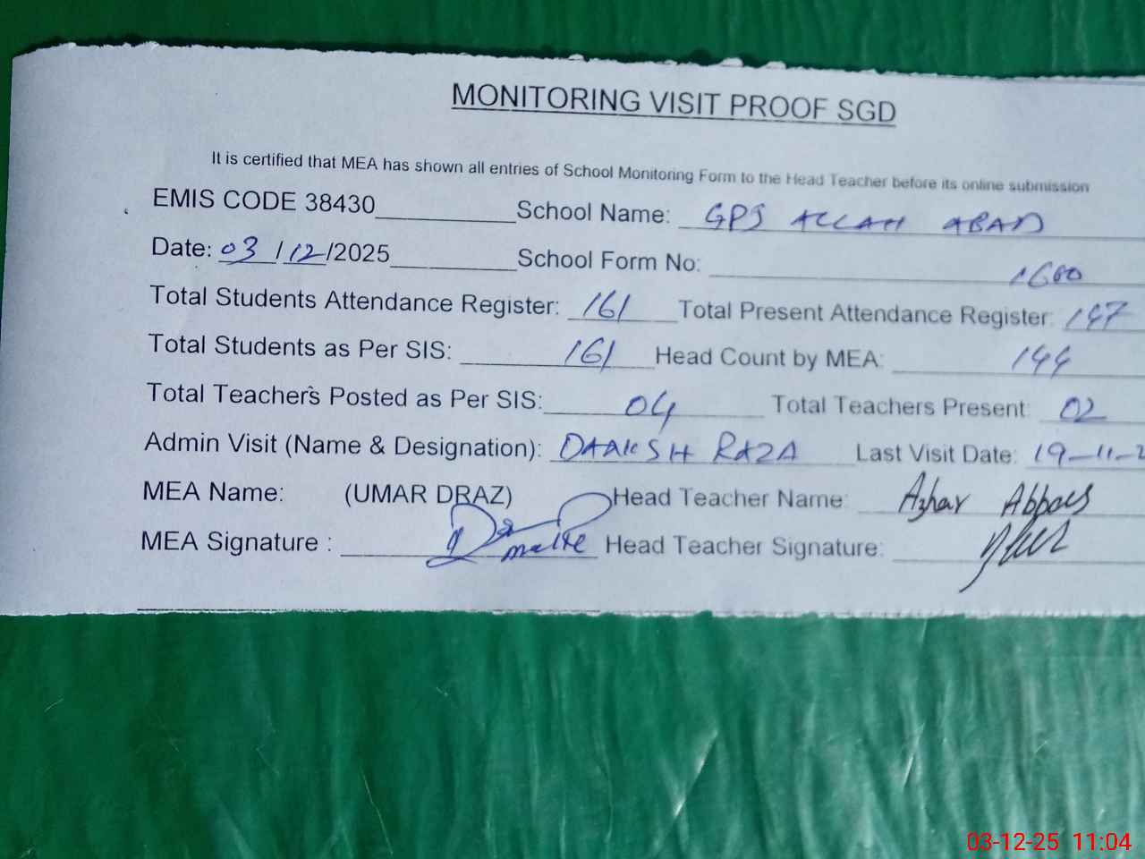 | EMIS Code: 38430153 | Name of School: GPS ALLAH ABAD | |||