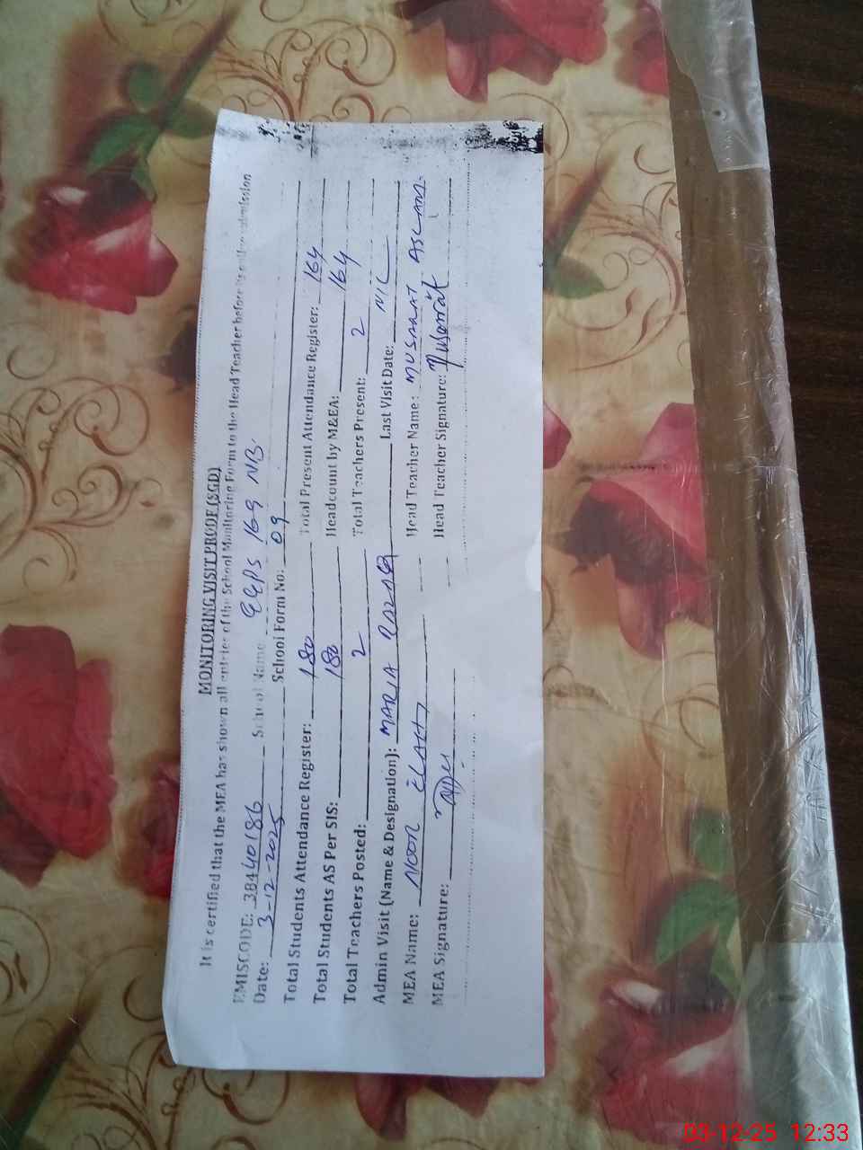 | Attendance Register | Head Teacher | MEA with School | Visit Proof |