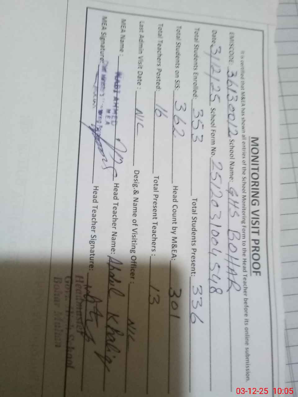 | EMIS Code: 36130012 | Name of School: GHS BOHAR MULTAN | |||