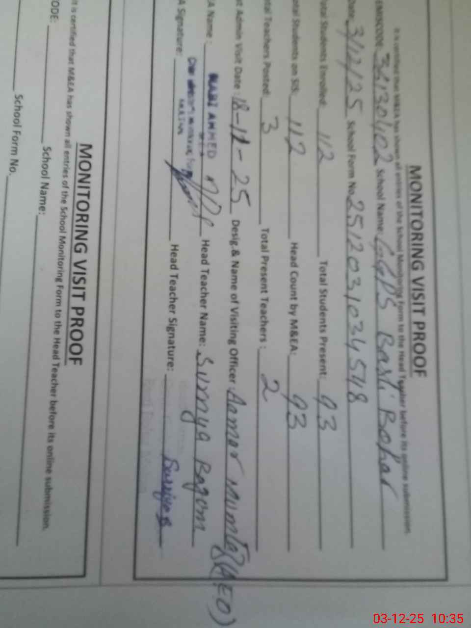 | Attendance Register | Head Teacher | MEA with School | Visit Proof |