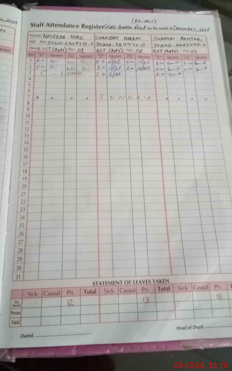 | CNIC | Full Name | Designation | R/C | Absence During Last Calender Month |