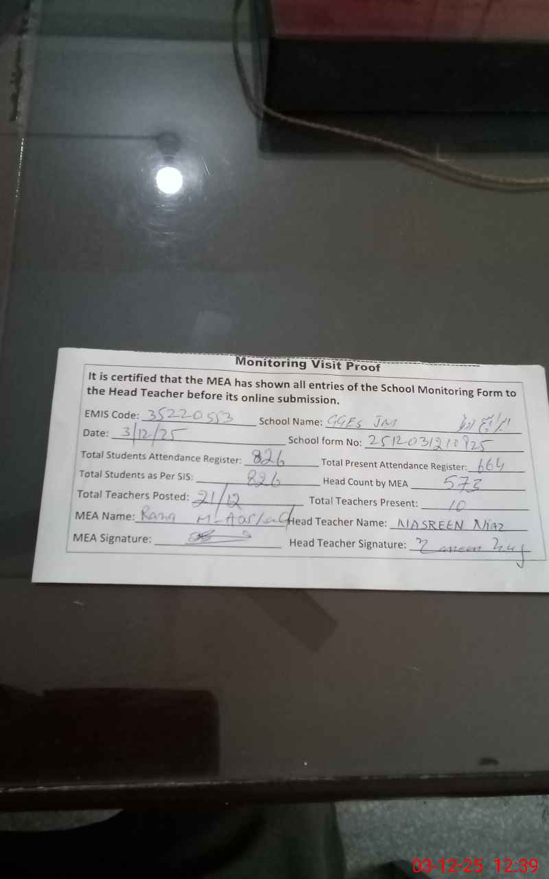 | Remarks (Use Separate Page if Required): Students attendance on register 664 Students attendance as per Head count 573 Difference found 91 Students percentage 69% NSB record not maintain month of November 2025 FTF record maintain with Led Pencil month of November 2025 School Cleaning poor | |||||
