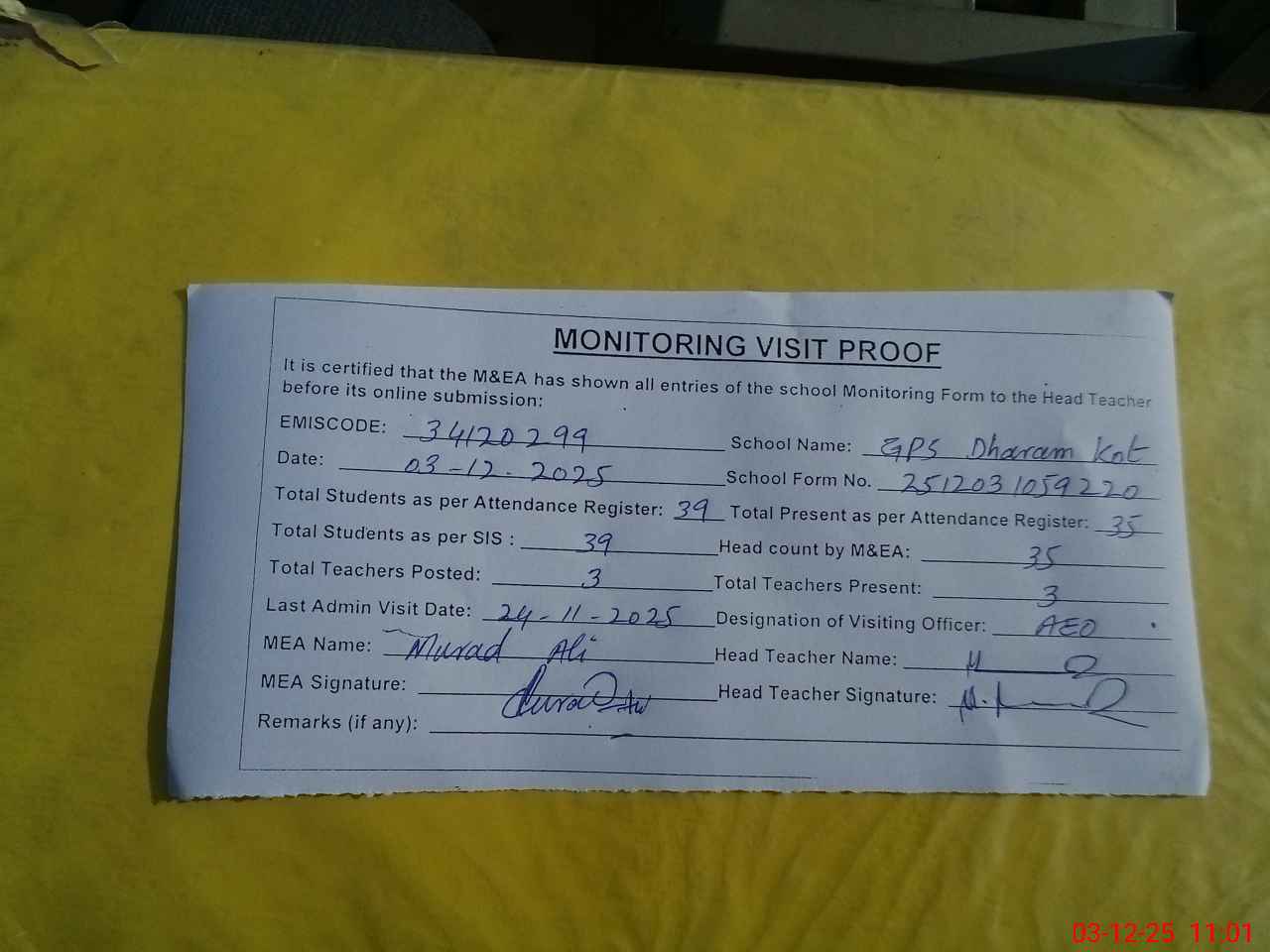 | EMIS Code: 34120299 | Name of School: GPS DHARAM KOT | |||