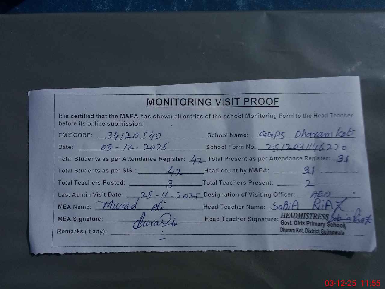 | EMIS Code: 34120540 | Name of School: GGPS DHARAM KOT | |||