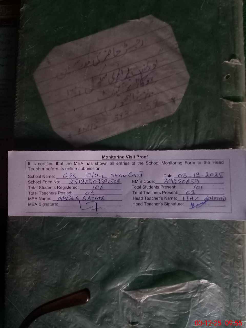 | Attendance Register | Head Teacher | MEA with School | Visit Proof |