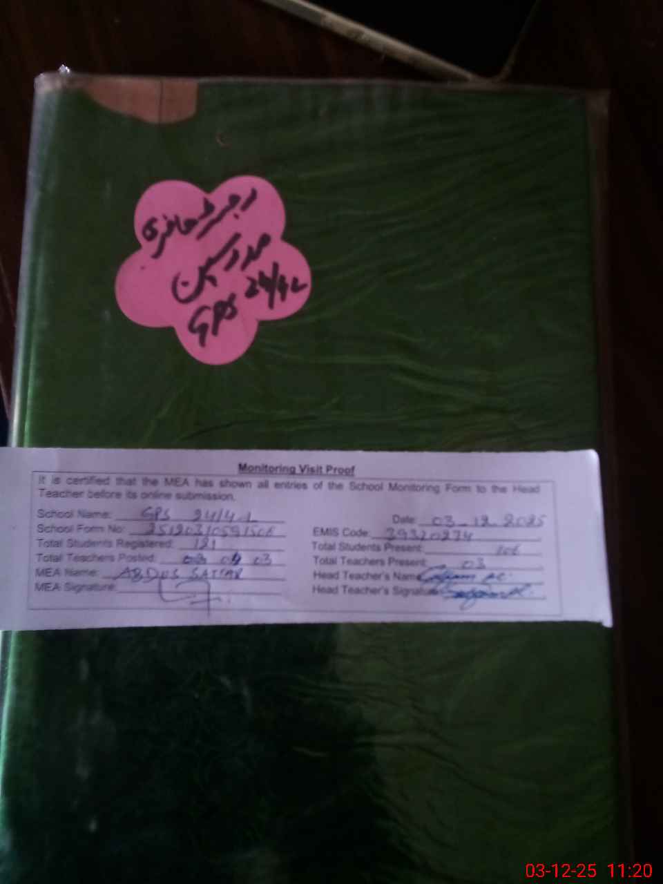 | Attendance Register | Head Teacher | MEA with School | Visit Proof |
