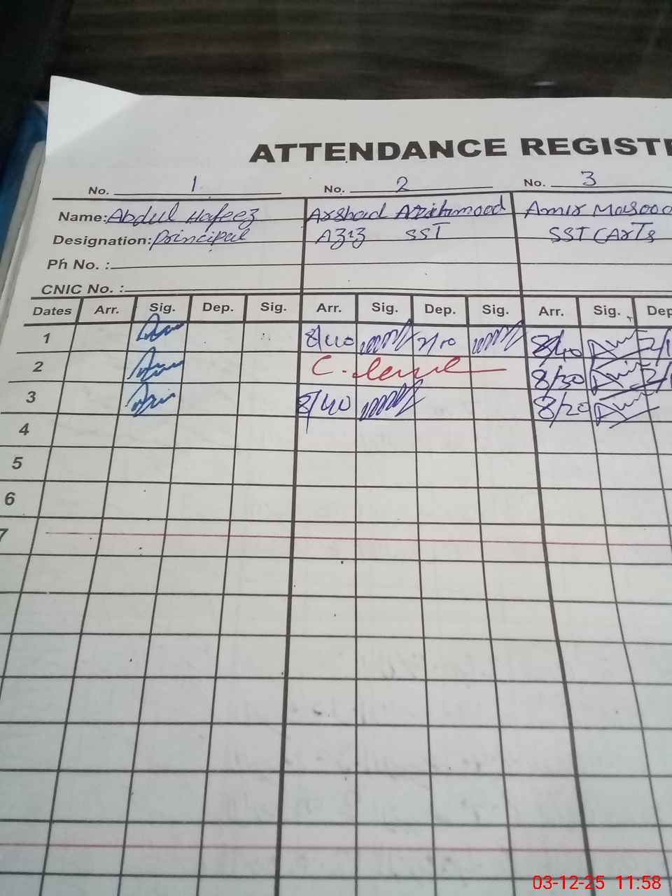 | CNIC | Full Name | Designation | R/C | Absence during last cal. month |