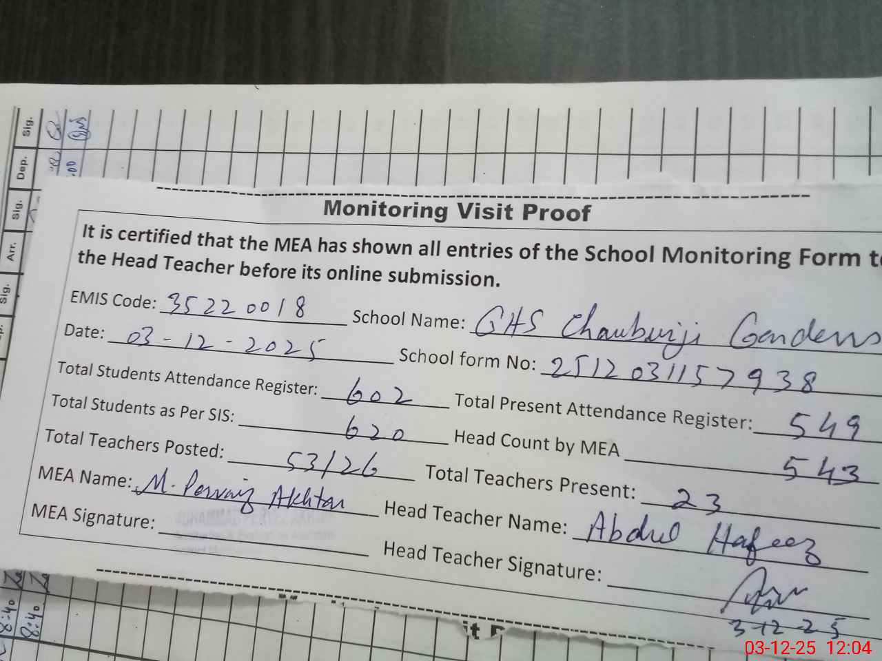 | Attendance Register | Head Teacher | MEA with School | Visit Proof |