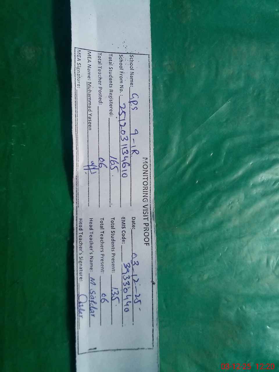 | Attendance Register | Head Teacher | MEA with School | Visit Proof |