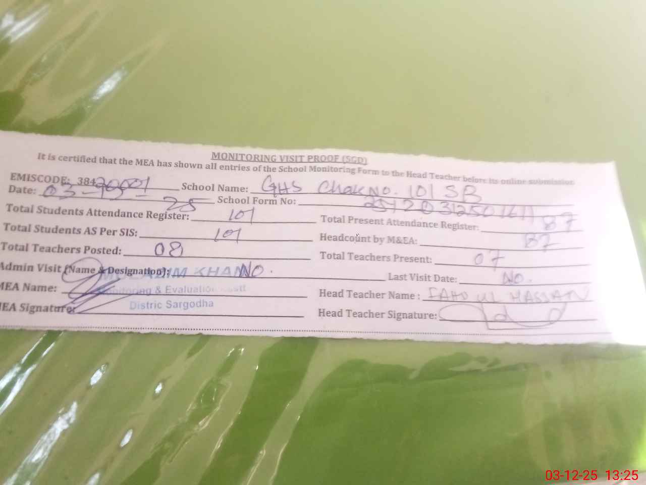 | EMIS Code: 38420001 | Name of School: GHS CHAK NO.101 SB | |||