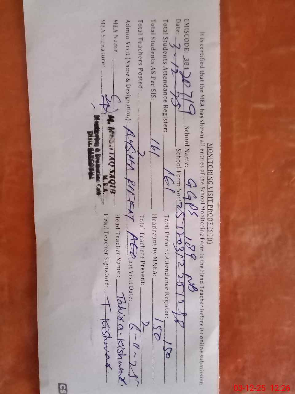 | Attendance Register | Head Teacher | MEA with School | Visit Proof |