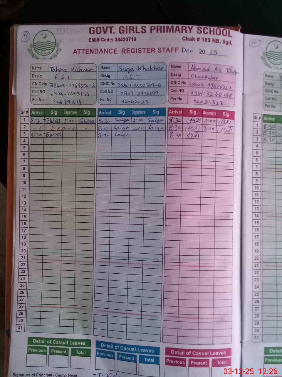 | CNIC | Full Name | Designation | R/C | Absence during last cal. month |