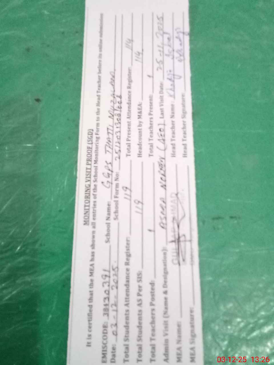 | Attendance Register | Head Teacher | MEA with School | Visit Proof |
