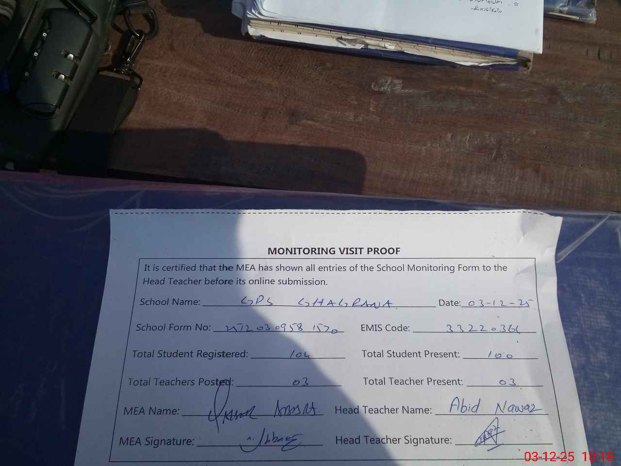 | Attendance Register | Head Teacher | MEA with School | Visit Proof |