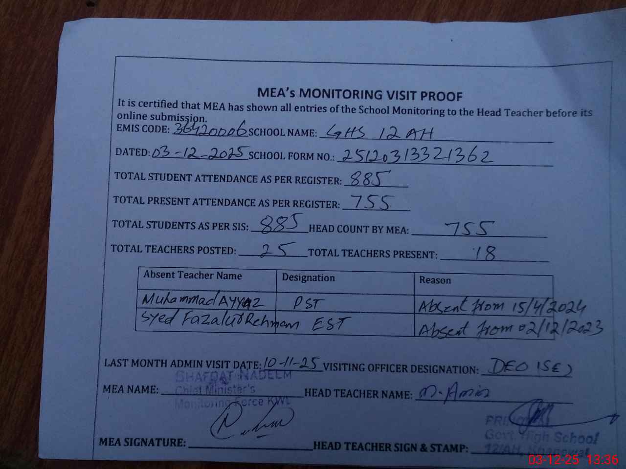 | Attendance Register | Head Teacher | MEA with School | Visit Proof |