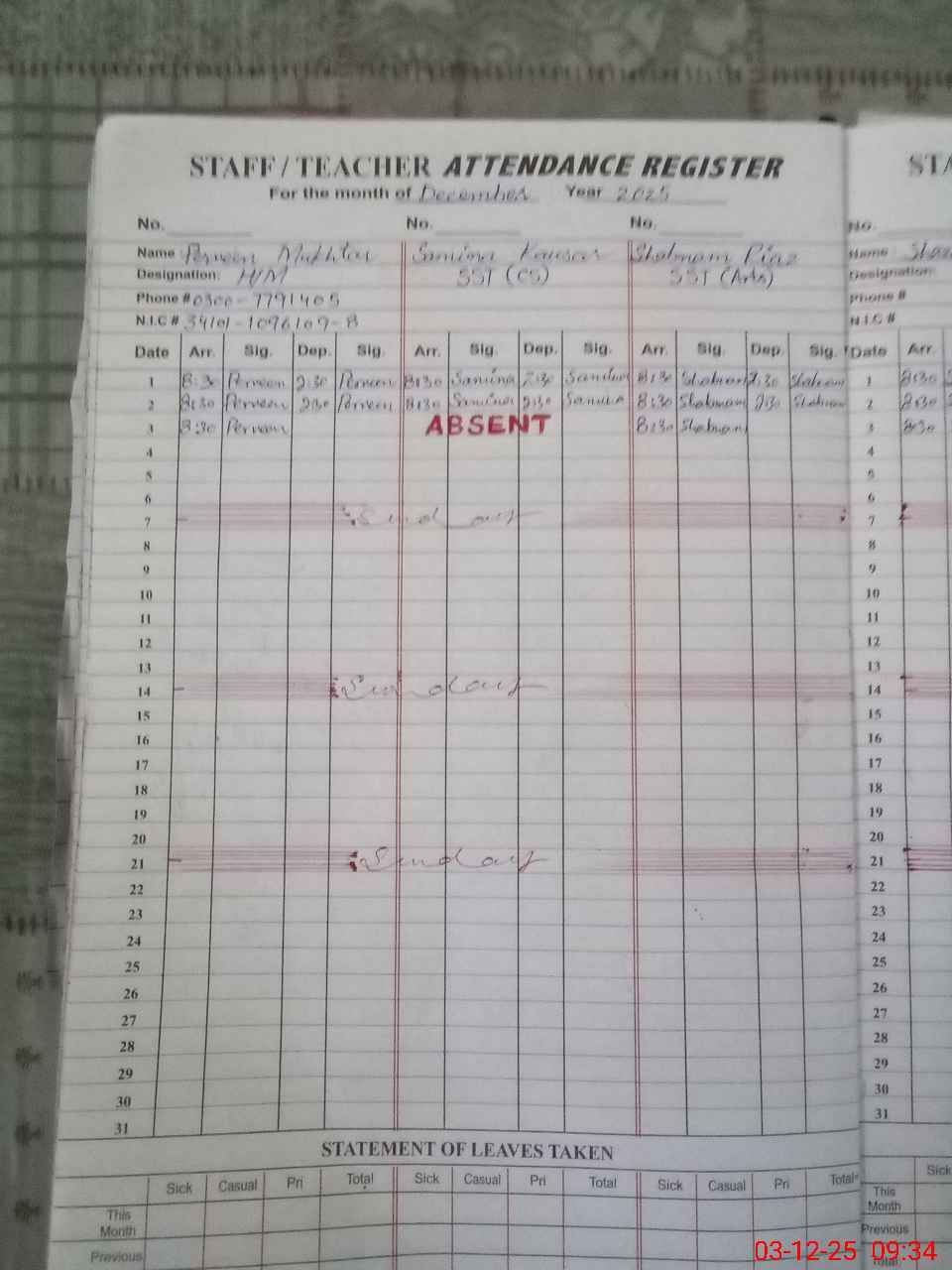 | 34**** | Sa**** Ka**** | SST Computer Science | Regular | 0 | 0 | 0 | 0 | 0 | 0 | 0 | 0 | 0 | Absent (Un-Authorized) |