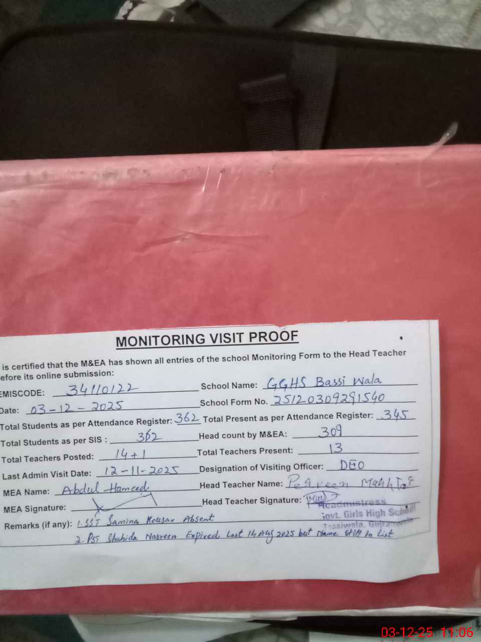 | EMIS Code: 34110122 | Name of School: GGHS BASSI WALA | |||