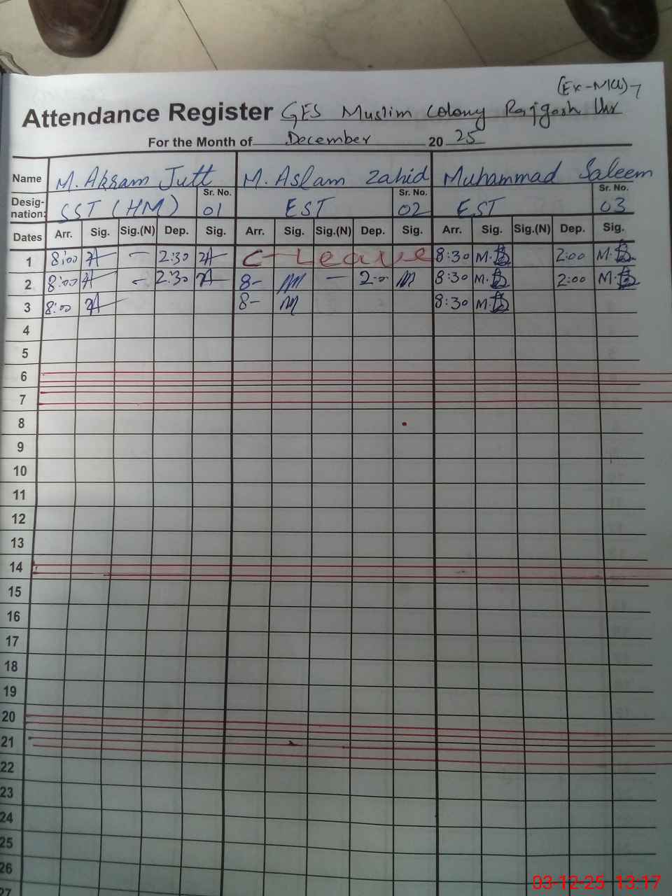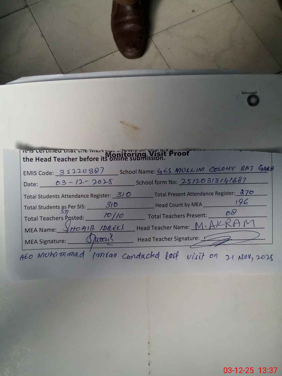 | Remarks (Use Separate Page if Required): 1. Maha PST shown on medical leave but leave record not available in the school so marked her absent 2 M Bilal chowkidar shown on stop gap but the written order has been expired since 06 Nov, 2025 | |||||
