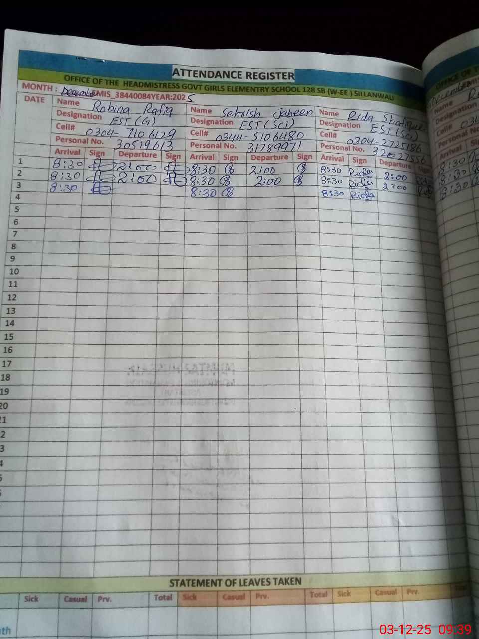 | Name: Se**** Ja**** Designation: (School Headmaster's/Headmistress's) EST SCI Phone/Cell Number: 03**** |