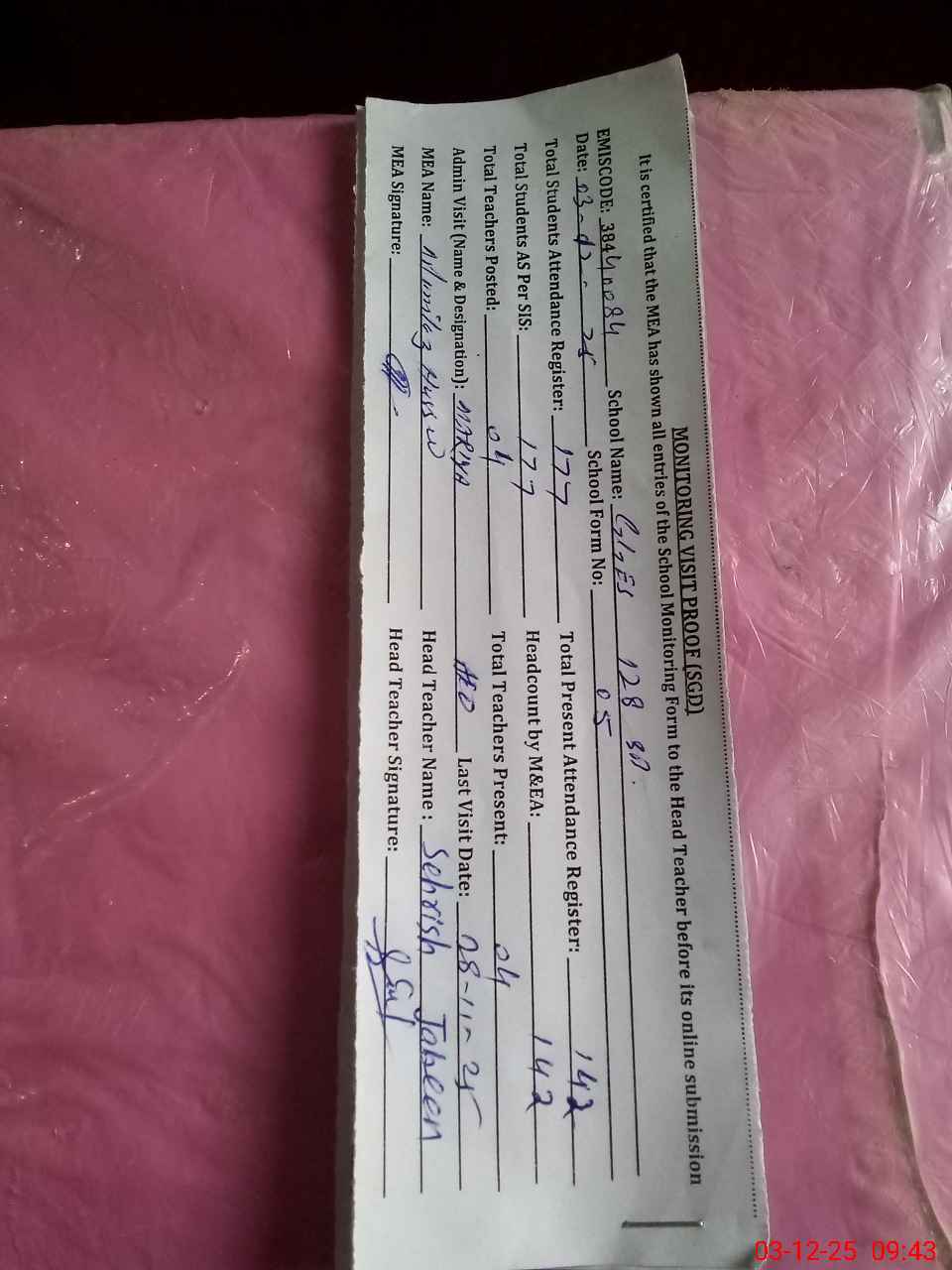 | Attendance Register | Head Teacher | MEA with School | Visit Proof |