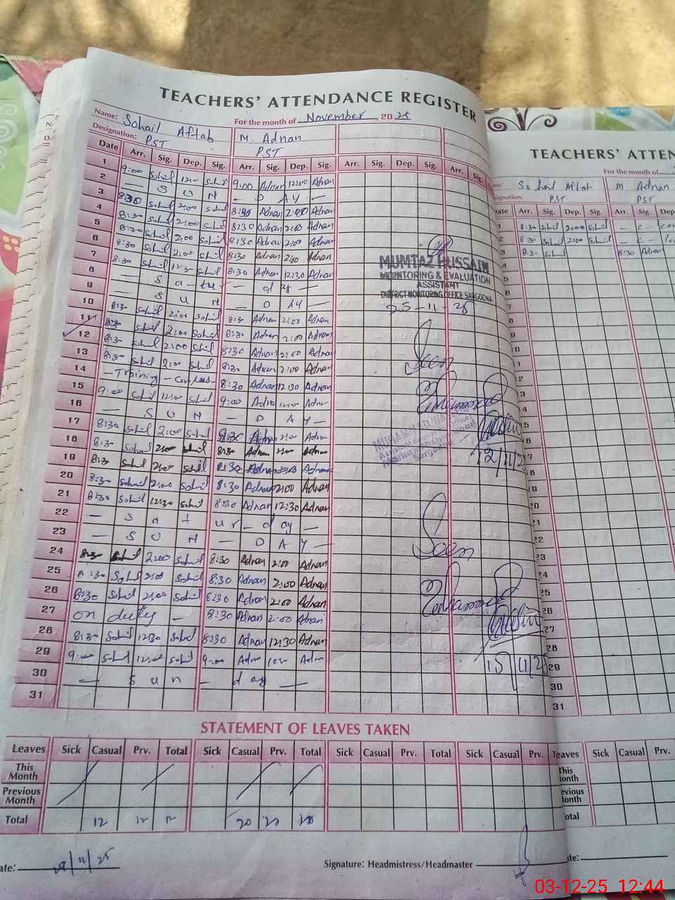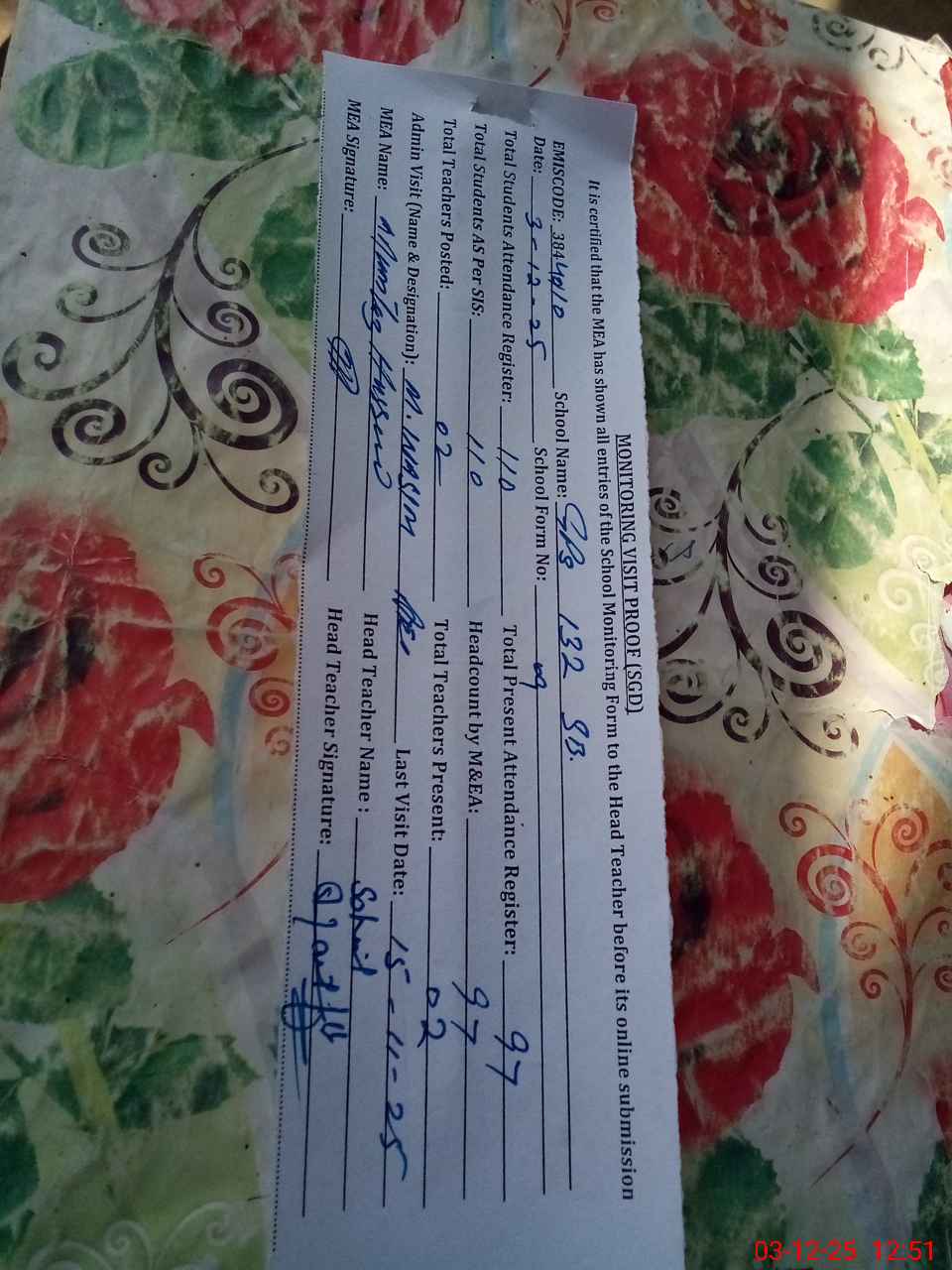 | Attendance Register | Head Teacher | MEA with School | Visit Proof |