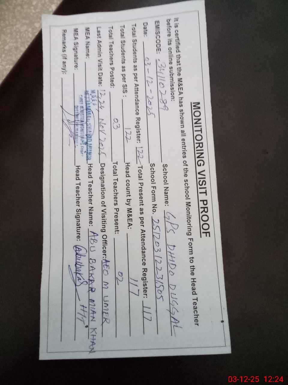 | EMIS Code: 34110289 | Name of School: GPS DHIDHO DUGGAL | |||