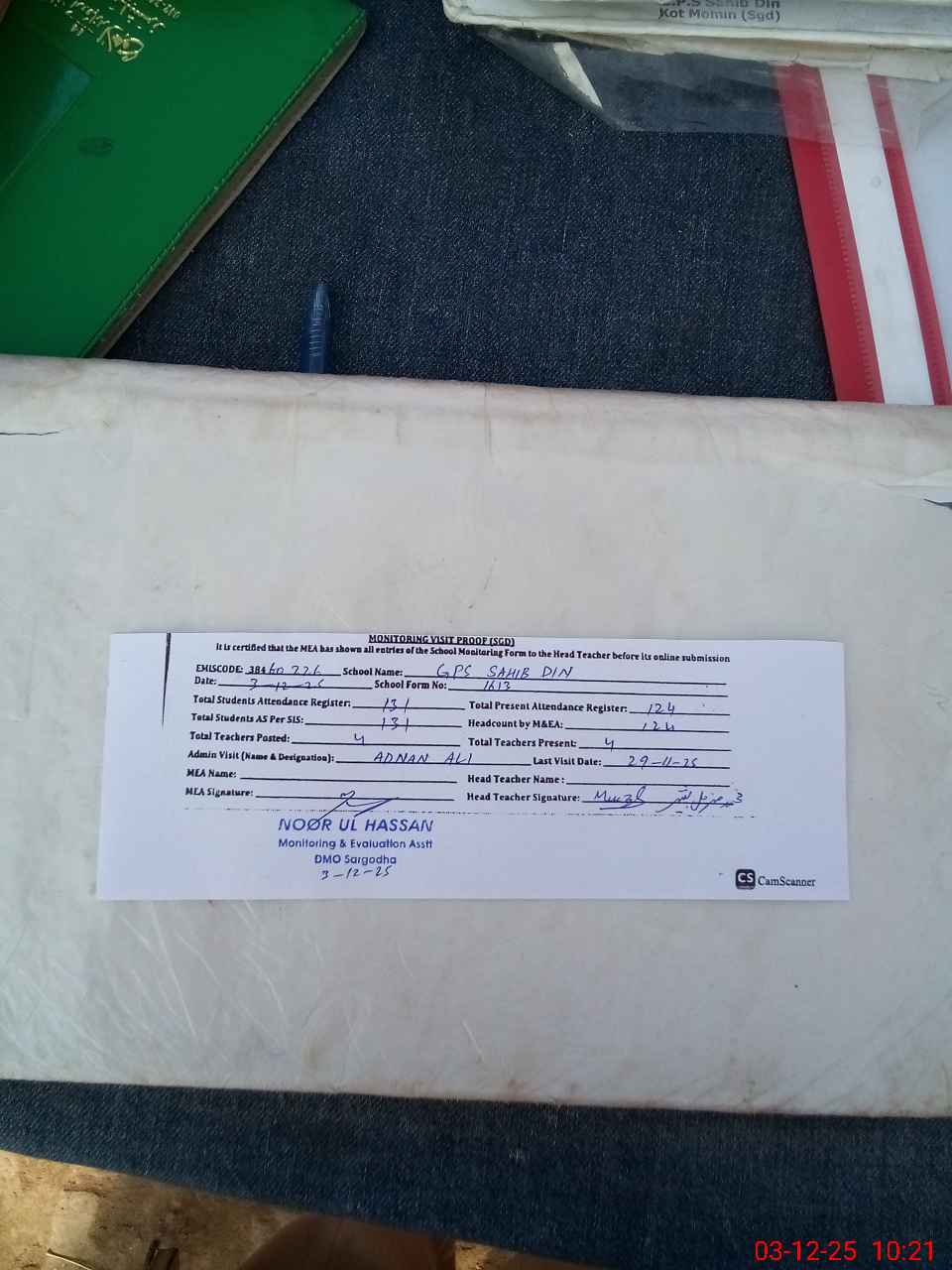 | Attendance Register | Head Teacher | MEA with School | Visit Proof |