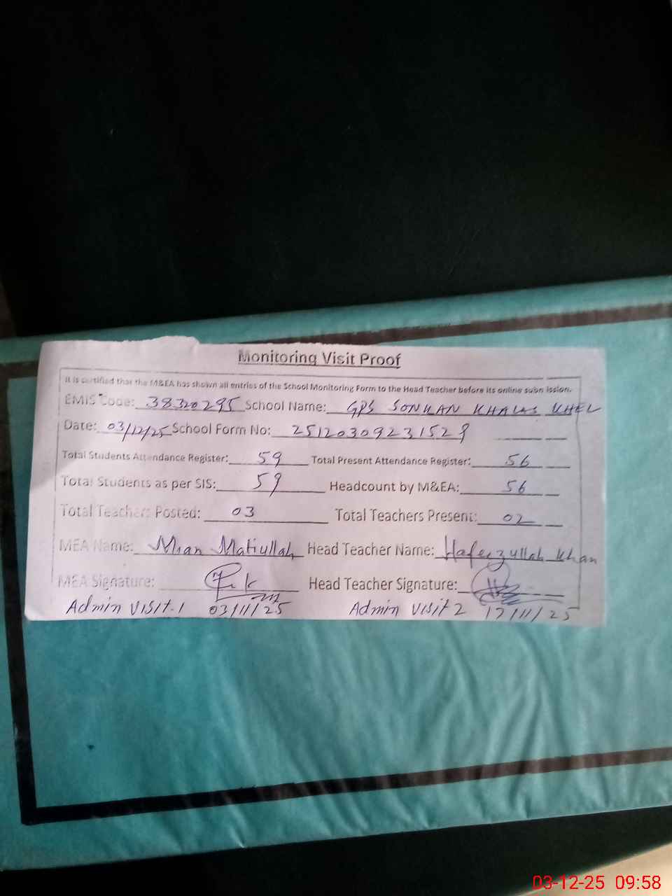 | EMIS Code: 38320295 | Name of School: GPS SONKAN KHALAS KHEL | |||