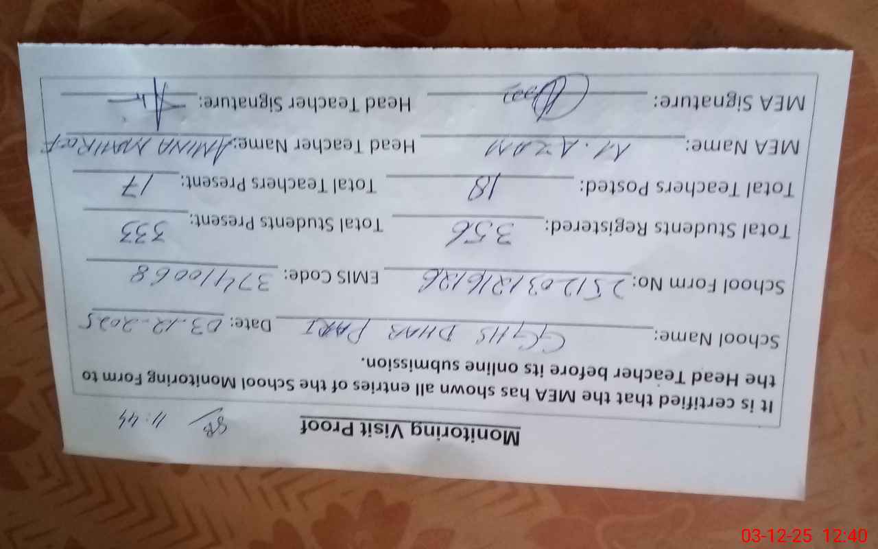 | EMIS Code: 37410068 | Name of School: GGHS DHAB PARI | |||