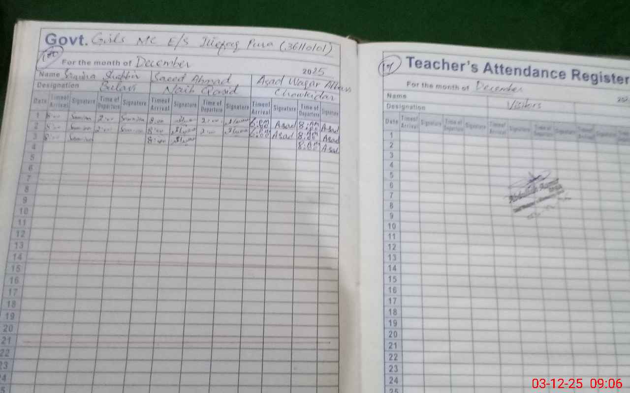 | Remarks (Use Separate Page if Required): Roznamcha of students not maintained Teacher Fatima Saeed Pst found Absent during the time of visit | |||||