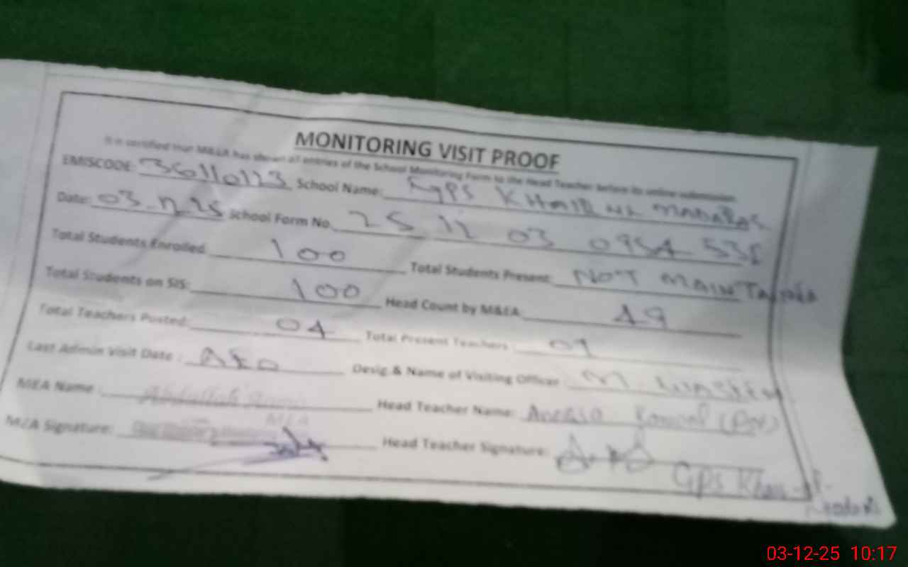 | EMIS Code: 36110123 | Name of School: GPS KHAIR-UL-MADARIS AURANGZEB ROAD MOHALLA GAOWSHALA | |||