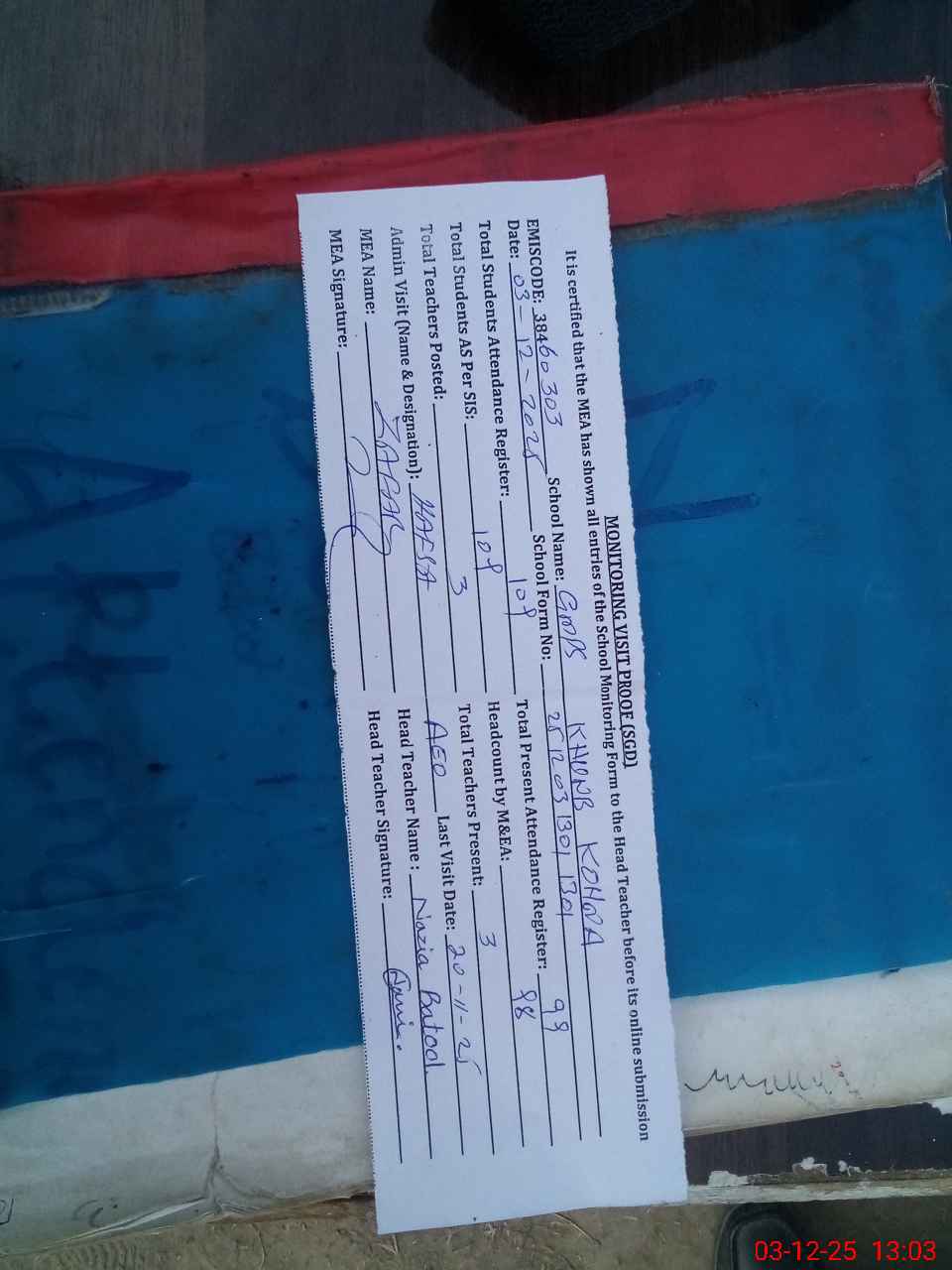 | Attendance Register | Head Teacher | MEA with School | Visit Proof |